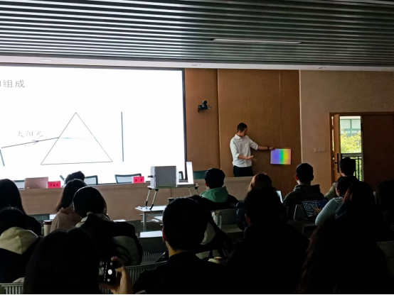 活动伊始,2022级物理学(师范)专业潘贺同学带来《光的色散》教学展示。通过实验演示,他结合实验演示和系统讲解,将传统板书与现代信息技术结合,生动阐释了彩虹形成的物理原理。其富有感染力的教学语言、层次分明的课程架构,以及师生互动环节的灵活把控,为在场师范生提供了优质的教学示范,赢得全场热烈掌声。